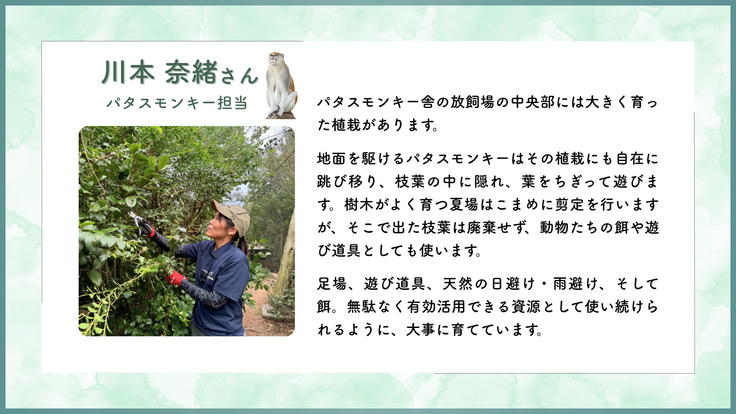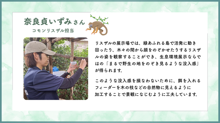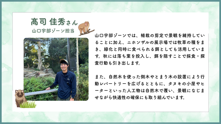 野生動物を展示するエリアでは、飼育担当者は動物たちの生活環境を快適にするとともに景観も保つことのできる工夫をすることで、来園者に生息地をイメージしながら野生における動物の生態や置かれている状況を知ってもらう機会を作り出しています。