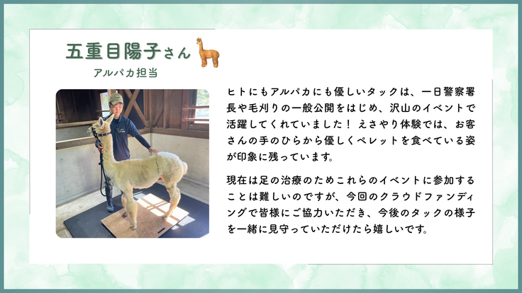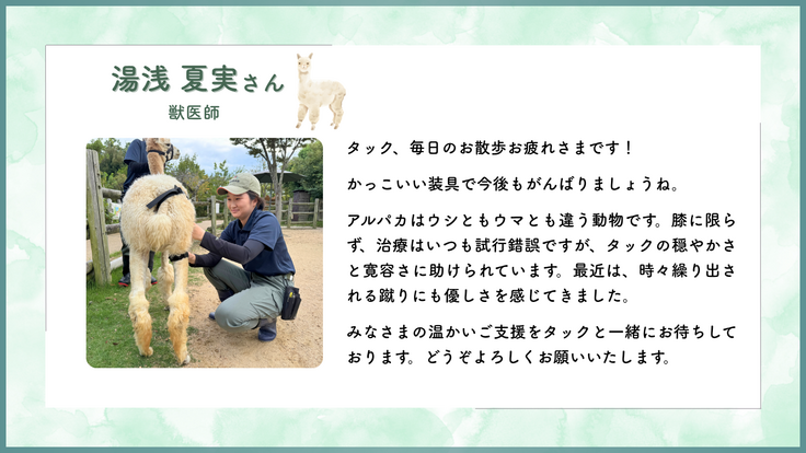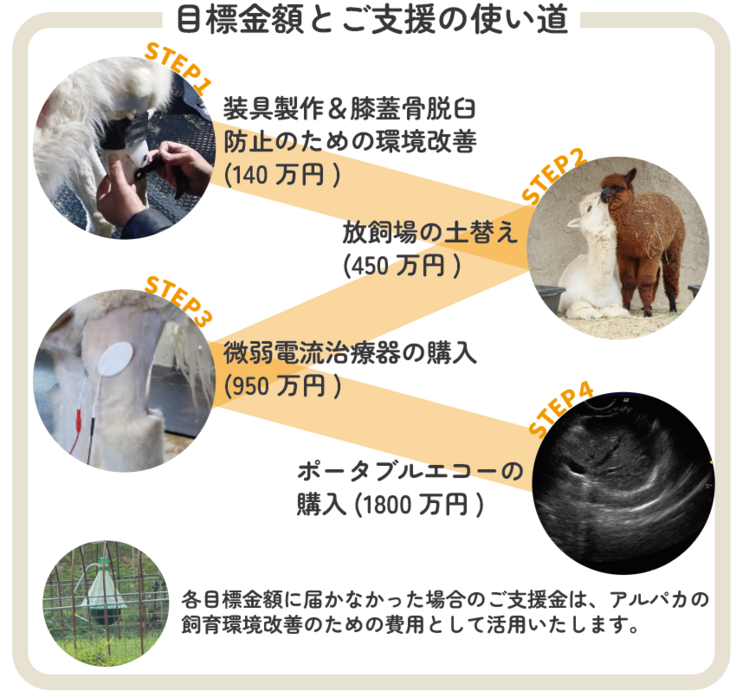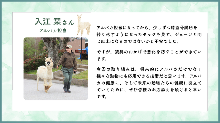 このクラウドファンディングでタックたちの膝を守るための対策をするとともに、今回の取り組みを多くの方に知ってもらい、アルパカの脚の疾患の治療や予防の一助になればと考えています。