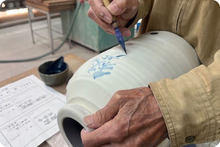 徳利の歴史は約400年前、江戸時代後期にさかのぼります。明治になると、徳利に屋号や銘柄が書かれた「高田徳利」が生産されるようになり、「文字書き」は手書きで行われ、高田・小名田では文化として継承されてきました。