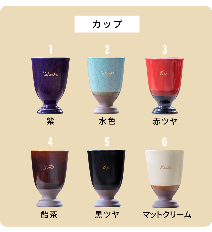 お酒が飲めない方、日常使いしていただきやすいものとして、名入れカップをご用意しました。色は6色あります。窯元さんと思いを共有しながら、共同で開発したものです。特別にご用意してくださった色と形のカップで、口当たりの良さはピカイチだと思います!
