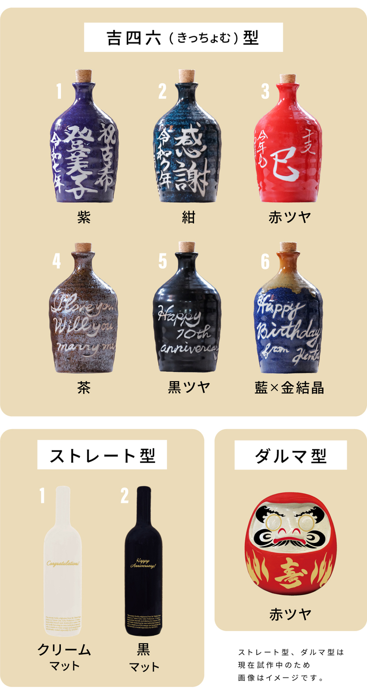 形状は吉四六型の他に、ワインボトルのような『ストレート型』と、縁起物の『ダルマ型』をご用意しています。現在、試作を進めいているため、活動レポートでお伝えしていきます。