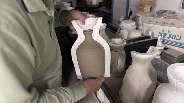 吉四六ボトルの生地は、伝統的な製法を用いて一本一本丁寧に作られます。まず、ガバ鋳込みと呼ばれる技法で成形します。これは、石膏型に泥漿(でいしょう)と呼ばれる液状の陶土を流し込み、一定時間放置して適度な厚みを持たせた後、余分な泥漿を排出して成形する方法です。この工程により、均一な厚みを持つボトルの生地が作られます◎写真は実際にみなさんの返礼品としてお届けする吉四六ボトルです!