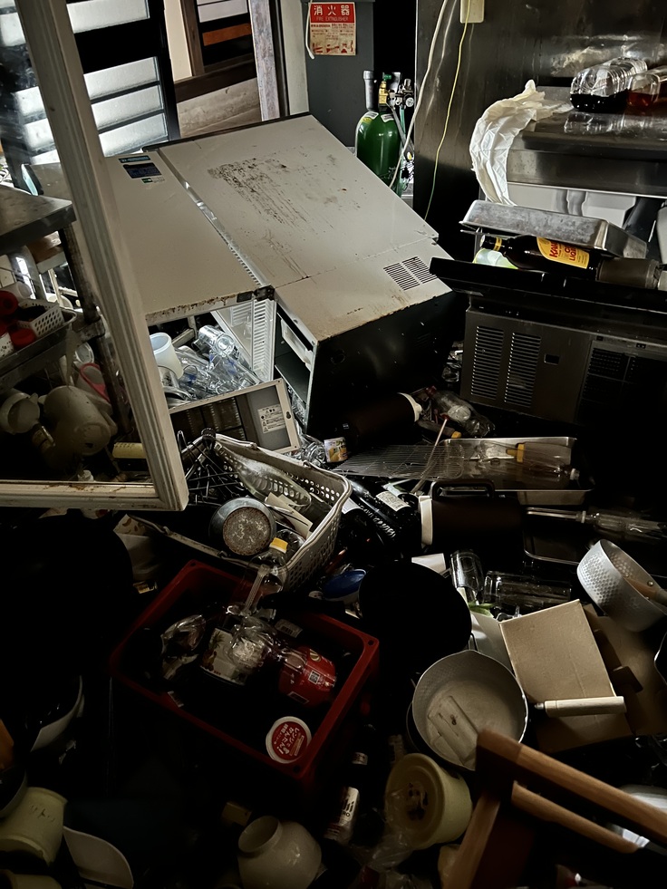 地震翌日、自店舗が心配になり向かうも、登久新がある飲食店街の観音町周辺は昔からの木造建築が多く、見るも無惨な状態になっていました。倒壊して道路を塞いだ建物を乗り越え店舗に到着。店舗建物は見た目は大丈夫そうだなととりあえず一安心し店内に入ると、やはり店内は悲惨な状況でした。棚の食器やコップ、お酒類はほぼ全てが床に投げ出され割れてしまっている。冷蔵庫やジョッキクーラー、ビールサーバー、真空包装機など目に付く物が倒れて破損していました。しかし設備や備品は壊滅的でしたが、幸運な事に家族やスタッフ全員とも連絡が取れ怪我もなく無事であることが確認できました。