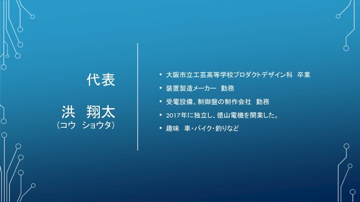 私は大阪市立工芸高校プロダクトデザイン科を卒業し、装置メーカーに就職、その後は受電設備、制御盤製作会社に転職し2018年1月に独立して徳山電機を立ちあげました。