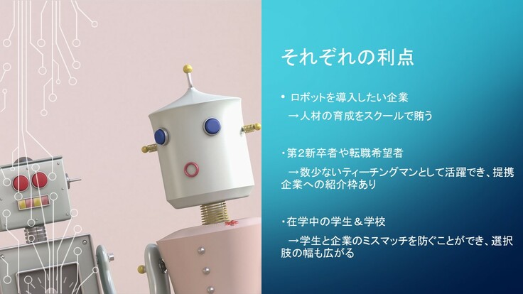 他にも順調に拡大した後、ロボットや機械設備などを学べるスクールとしての運用を予定しており、多くの企業様と提携しティーチングマン派遣に加え提携企業様のティーチングマン育成もできると考えております。