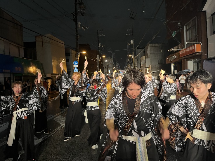 台風の接近により開催自体危ぶまれましたが、本番当日は天気にも恵まれ無事踊ることができました。1日目の最後は大雨にうたれましたが、参加者の熱気は衰えるどころかむしろ上昇し「よさこい最高!」と叫び踊りきりました。