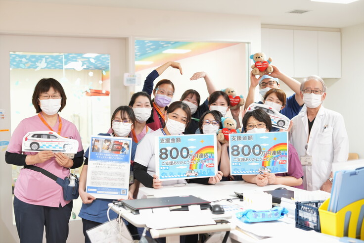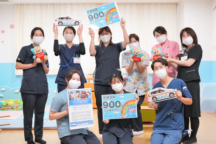 そして900万円の達成写真は小児科病棟メンバーで、こちらは遊び道具が広がるプレイルームで撮りました!