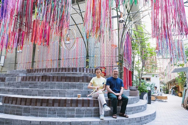 Slow Art Collectiveはオーストラリア・メルボルン在住の加藤チャコとディラン・マートレルが主宰する芸術グループです。東京ビエンナーレ2023では、持続可能性や多文化共生をテーマに、竹やロープなどの自然素材、街で拾い集めた素材を用いた市民参加型のアートプロジェクトを行いました。
