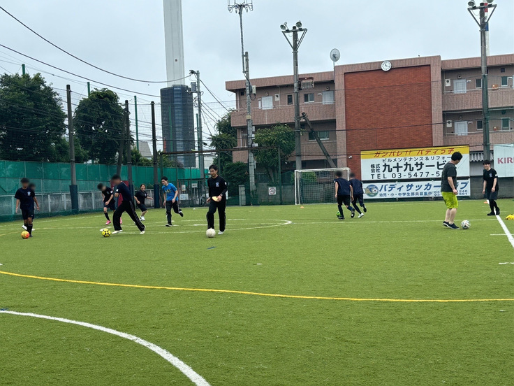 初めに鬼ごっこでウォーミングアップをした後、パス練習やドリブル練習をして2チームに分かれて試合をしました。