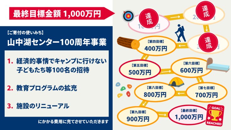 すでに多数のご協力をいただいていますが、支援の輪をさらに広げ、多くの方に山中湖センターを知っていただき、当キャンプ場の未来、子どもたちの未来を応援していただきたく、SNSでのシェアやご友人へのメール転送など、周りの方々にもこのプロジェクトを広めていただけますと幸いです。