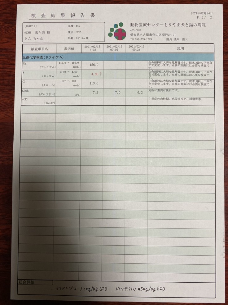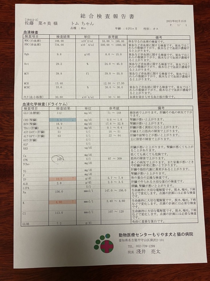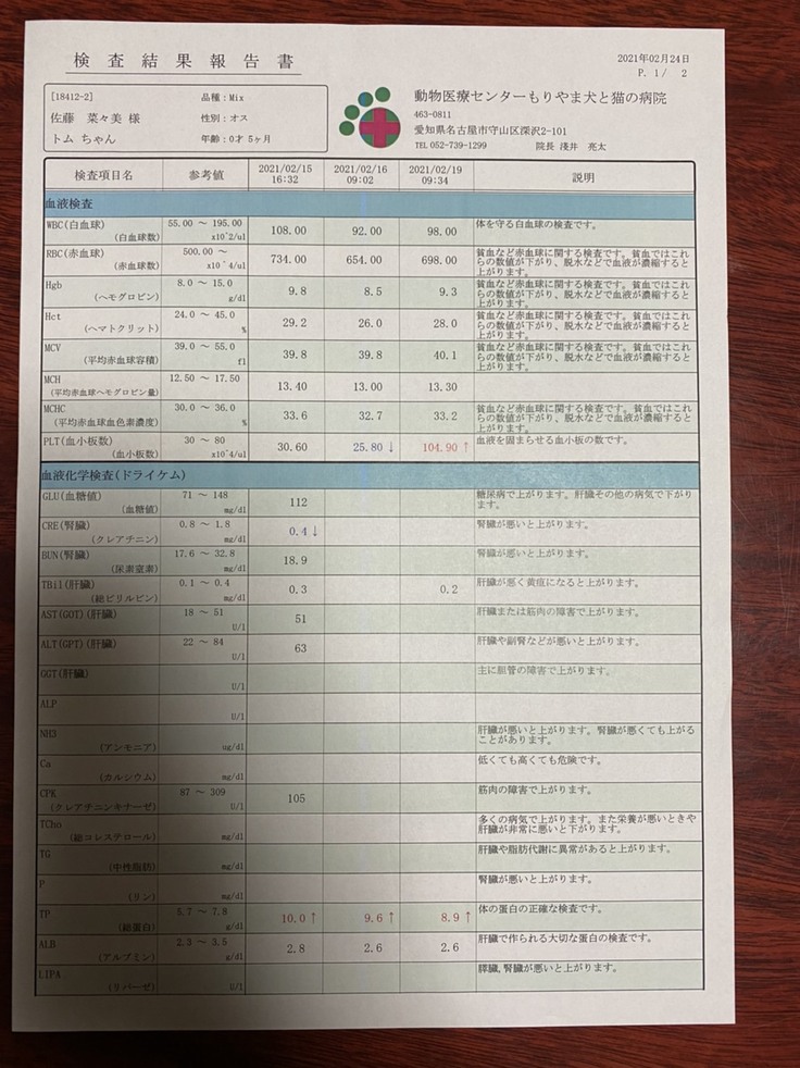 そして獣医師からFIP陽性と伝えられ、もう一度病院で血液検査を行った結果は写真の通りでした。かかりつけの獣医師からはFIPには「特効薬がありません、今数値はそこまで悪くはないのでトムちゃんの免疫を信じ、インターフェロンと抗生剤で延命治療をしていきましょう」