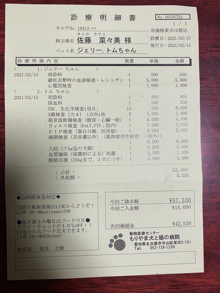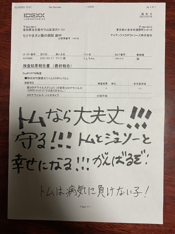FIP検査結果を伝えられたのは入院してから4日後のことでした。
