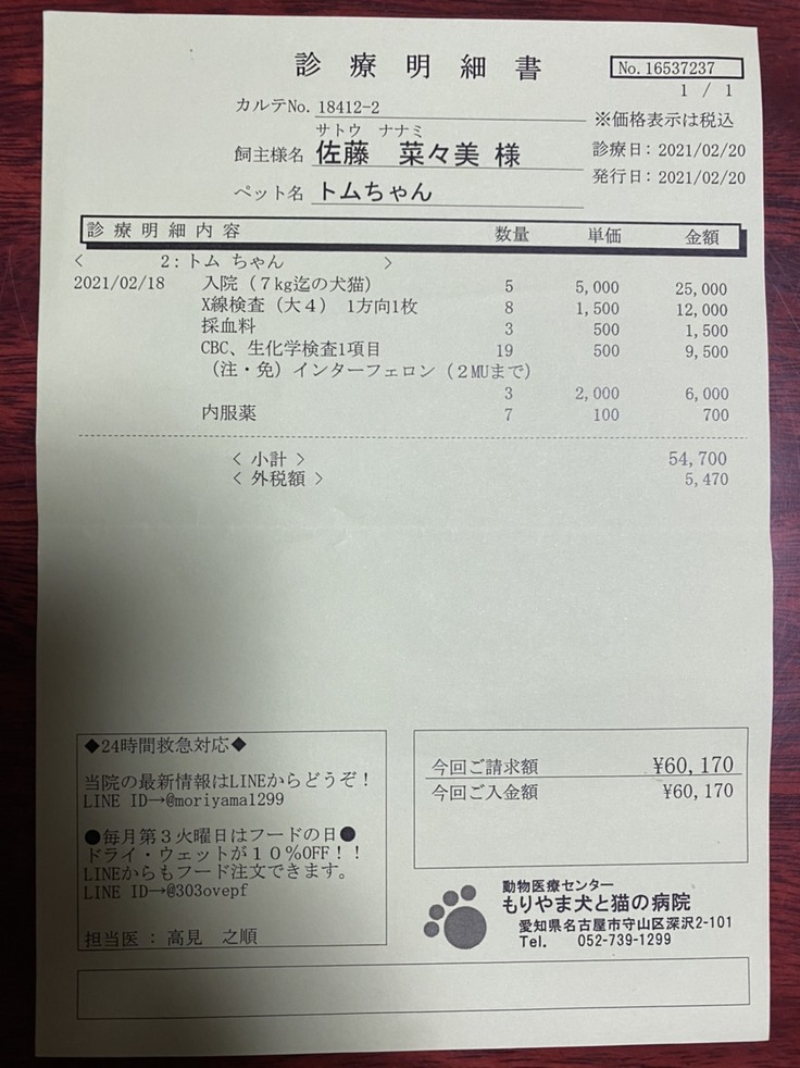 手に届きそうもない程の値段で驚きました。私たちでは出せない金額で、自分たちが情けない、悔しい思いでいっぱいでした。当初ネコを飼うにはお金がかかることだと分かったうえで飼うことを決めたのですが、まさかこんなにも高額になる治療があることは思いませんでした、