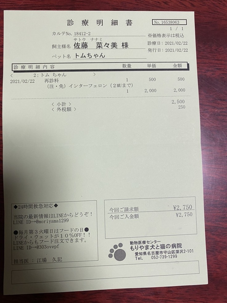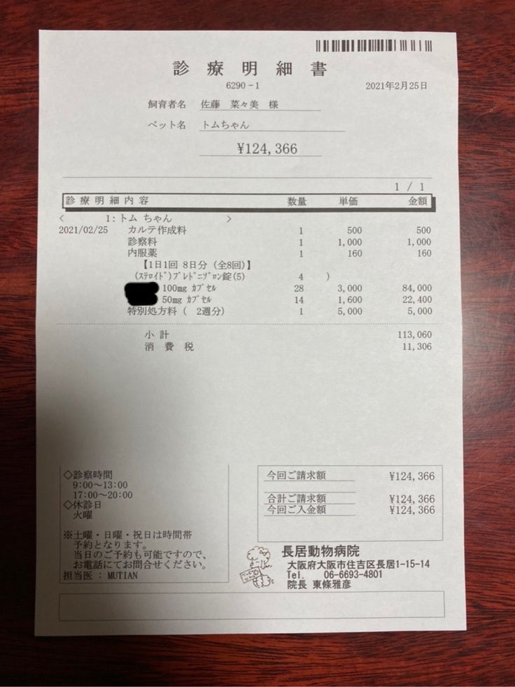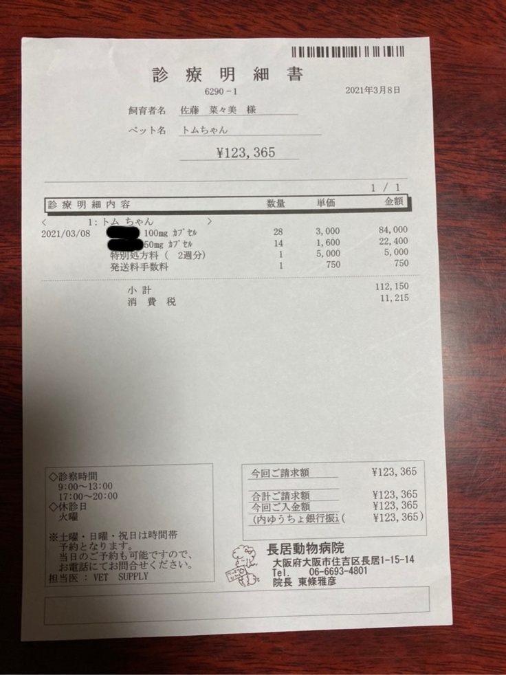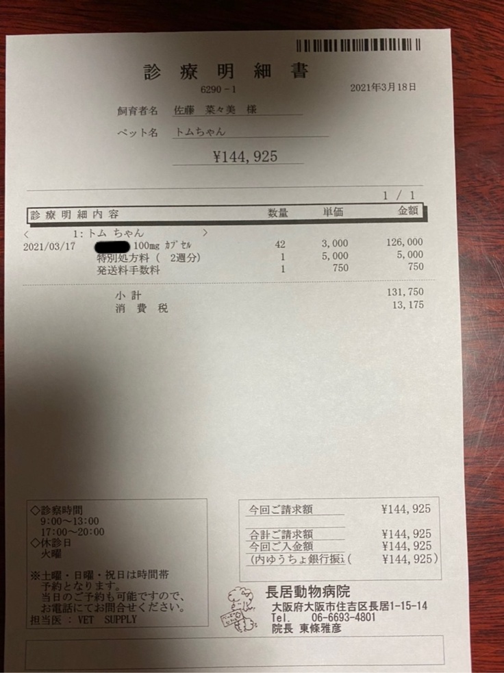 新薬はさきほどでもありましたように、日本ではまだ承認されていない新しいお薬です、そのため、とても高額で1日1万円前後(体重によって投与する量が変わる)×84日間+検査代