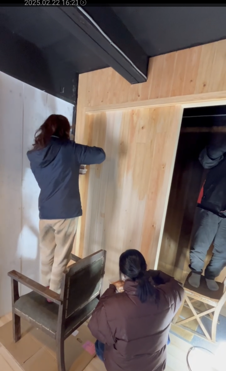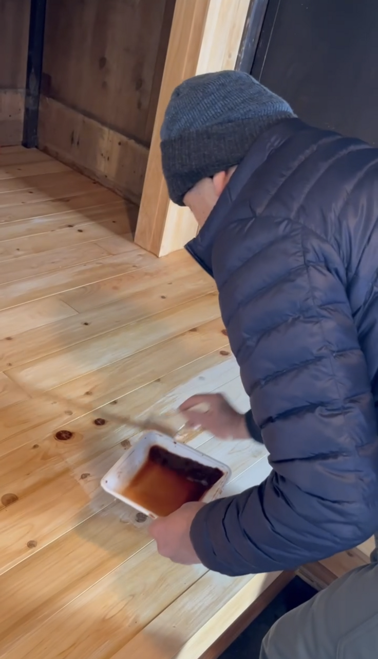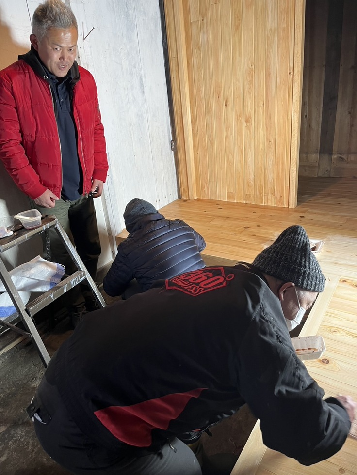 雪の降る中、1回目の柿渋塗りが無事終了しました✨