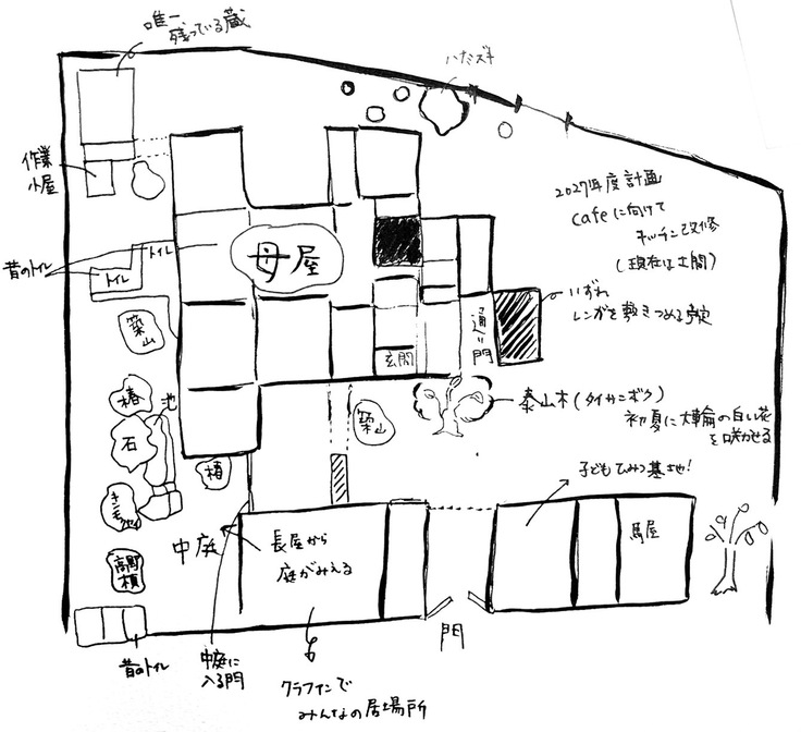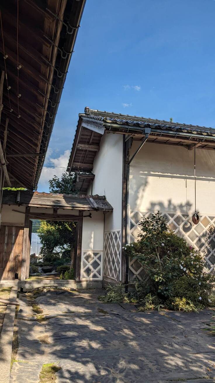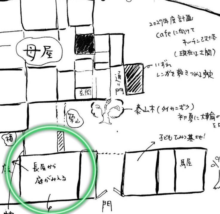 門をくぐると目の前には母屋が見えます。門長屋の左が今回改修を進めている長屋。そして右側が、この先「子ども秘密基地」としてDIYを計画している場所になります😊