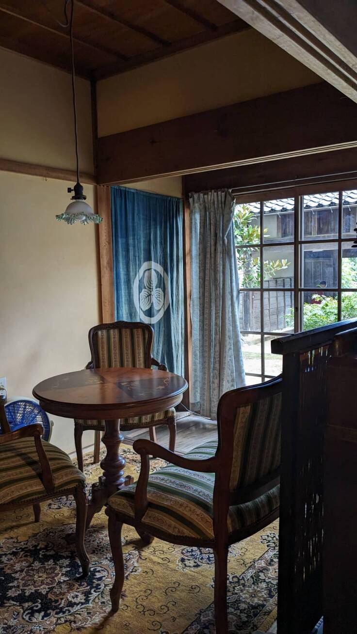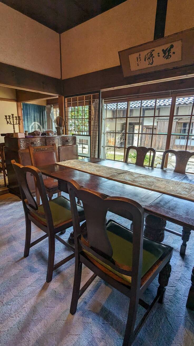 (アンティーク家具が好きな当主計子さんが集められたオランダの拡張テーブル。窓からは長屋が見えます)