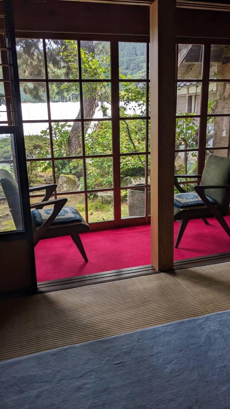 (赤い絨毯と石庭のコントラストが美しくこの席も人気の場所です)