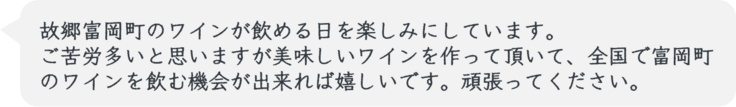そして、ワインは、熟成というプロセスを楽しむことができます。毎年の味の変化を楽しむことができます。1本1本の木が、町の景観を形作っていく様子を見守ることができます。 長い時間をかけて様々な楽しみ方ができるのがワインです。時間はかかるかもしれません。私たちの代で最高の結果を残せないかもしれません。でも、次の世代、次の次の世代に引き継ぐ宝として、今を生きる私たちがこの地域のワイン産業の土台を築く。それが、100年後の魅力的な富岡町を創るための確かな道筋だと信じています。