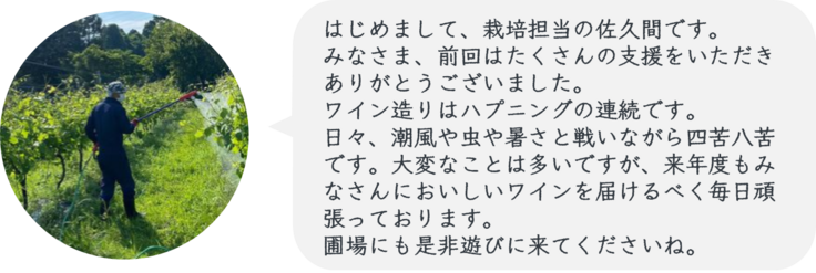 立上げから5年、ようやく皆様にワインを届けることができたことをうれしく思っています。また皆様からの沢山の応援コメントもすべて大事に読ませていただきました。つらい時、大変な時、皆様の応援が私たちの励みとなっております。
