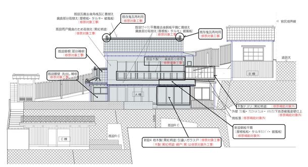 痕跡調査の結果、大正時代を物語る「かく桟瓦」が使用され、建物の大きな特徴となっているガラス戸には「ながしガラス」、木材も大正期の技術が分かる多くの痕跡が残されていました。この結果を受けて、より完全な姿で残すべきと考え、新材も使う"修景工事"ではなく、大正期の工場の主人の別荘として使われていた頃の完全な当時の姿に戻す"修復工事"として事業に着手することにいたしました。