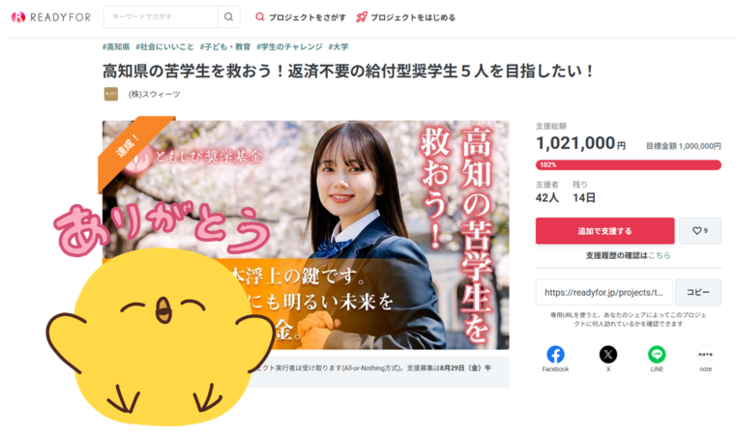 100万円は突破しましたが、安定的な奨学金を継続的に集めるためにも期間いっぱいの8/29(金)までクラウドファンディングは続けたいと思います。引き続き、応援のほどよろしくお願いします!!