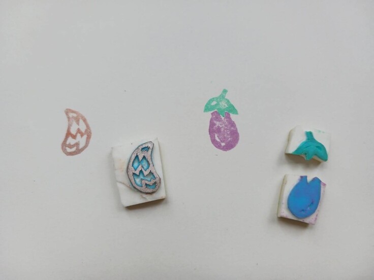 なんとこの海老芋と茄子の模様は、館長が手作りした消しゴムはんこで作られたものなんです!
