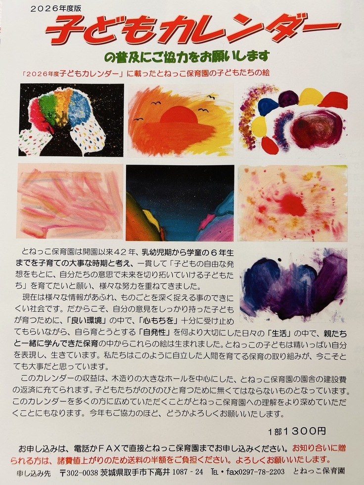 とねっこ保育園をはじめ全国の子どもたちが自ら感じ、自ら考え、自らを表現した絵を掲載した「こどもカレンダー」の2026年度版が無事に完成しました。カレンダーは絵が見やすいオールカラー大判(たて560mm×よこ380mm)。絵画を飾るような感覚でお楽しみください♪