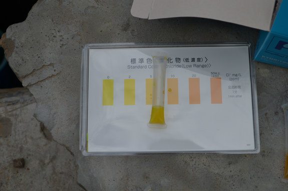 ちなみにトイレの水に雨水が入っていることの証明として、塩化物イオン濃度の比色試験も行いました。