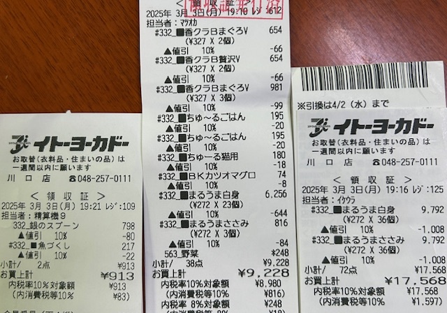 下記、2月28日時点の残高が47,848円でしたが、3月3日に27,709円まるうま缶等を購入しておりますので、3月7日現在の残高は20,169円になります。