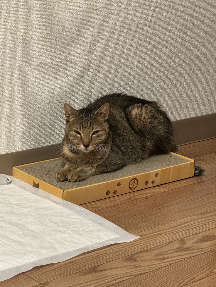 お気に入りの爪とぎの上でくつろぐとらちゃんです。