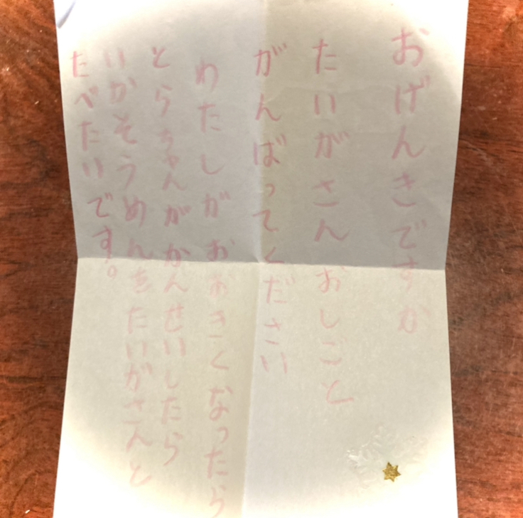 5歳児から手紙を受け取りました(お父様代筆)。