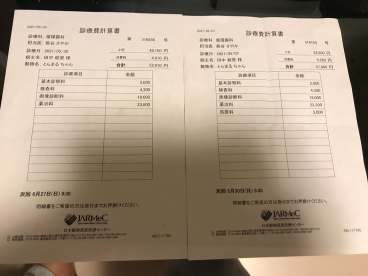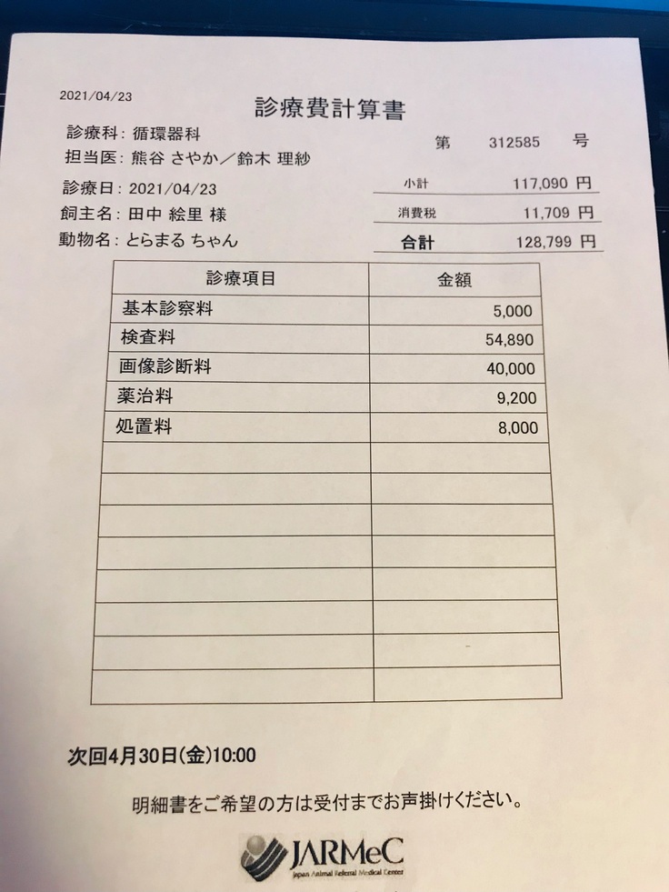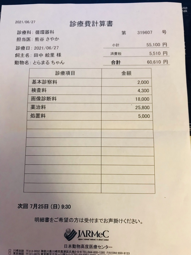 紹介してもらった、循環器専門の高度動物医療センターにて追加の詳細検査・処置をしてもたいました。