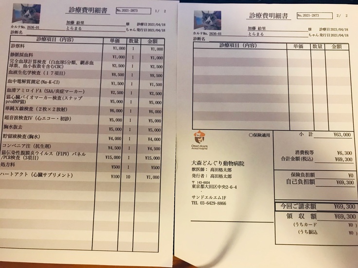 ※猫伝染性腹膜炎(FIP)や癌の可能性もあるとあると言われたため。