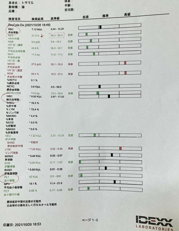 血液検査の結果、かなり貧血が進んでいて、「免疫介在性溶血性貧血(IMHA)」(免疫の異常反応により自分の赤血球を壊し、貧血になる病気)の可能性が高いと診断されました。