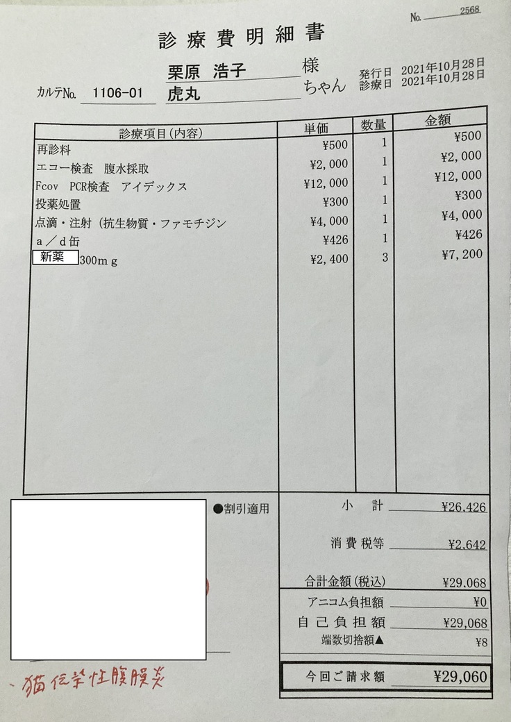この時点でFIPの疑いが強い、と診断され、難しい病気であること、最近出回っている治療薬があることを説明されました。詳しくは腹水の採取後、ということで、2~3時間後に腹水採取が終わってから迎えに行くことになり、ひとまず虎丸を預けて帰宅。