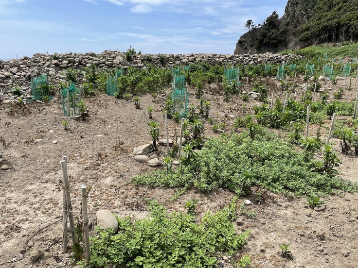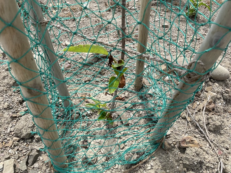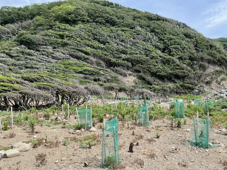 カイヅカイブキは順調に育っていますが、サンゴジュがシカの食害に遭ってしまったので、苗の周りに漁網を張ると同時に、シカの駆除もお願いしました。