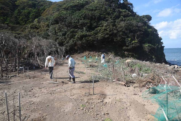 一昨年の台風想定して、海岸の石垣をかさ上げをしていましたが、想定を超える高波が押し寄せ、大量の海水が植樹した区域に流れ込んで、押し流しました。そして海水が流入した区域の植樹は壊滅状態となりました。