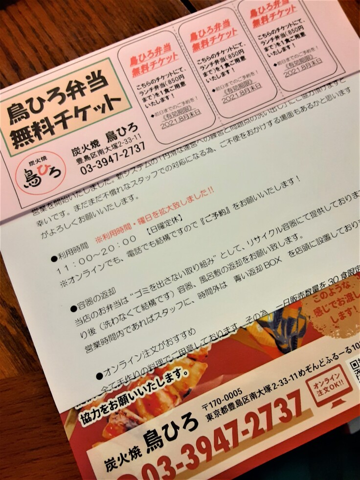 ①特定非営利活動法人豊島子どもWAKUWAKUネットワークさんが実施している「としまフードサポートプロジェクト」に参加させて頂いております。月に一回食料や生活用品などの配布をしており、当店は寄付と同時に鳥ひろで今後進めたい取り組みの、ご意見を伺うため「鳥ひろ弁当 無料チケット」を配布しております。好きな時間に、出来立ての料理を入手出来る事は、食費だけではなく貴重な時間の節約にもなるのではと思っています。