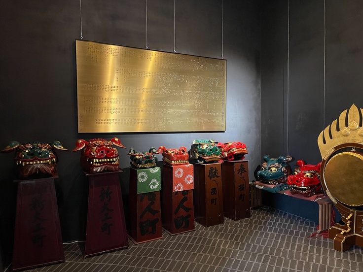 下に並んでいる獅子頭は氏子の方から奉納された品々です。