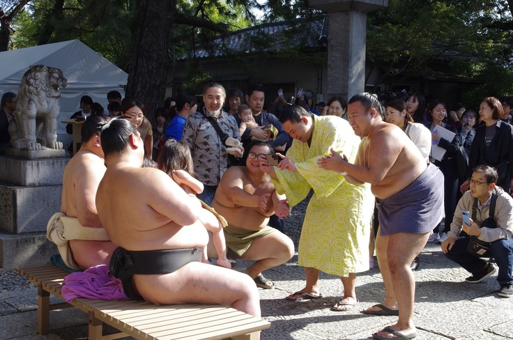 力士たちも稽古の終わりにも関わらず、楽しそうに赤ちゃんと触れ合っていました。