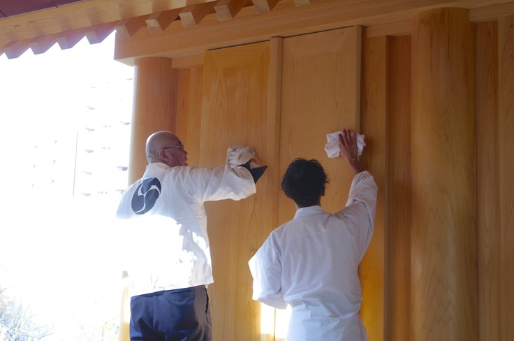3)本殿の外扉、本殿拝殿をつなぐ廊下を水拭き