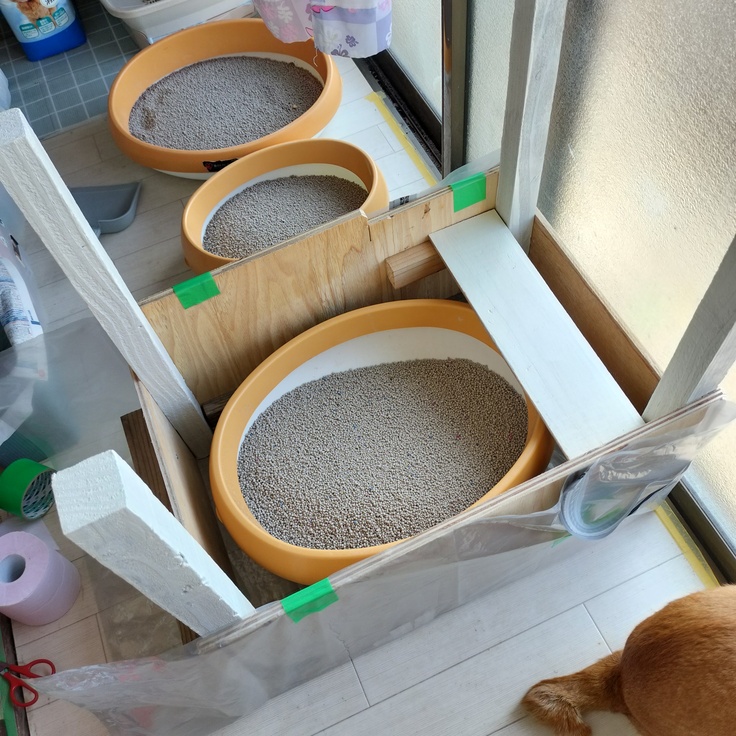 外に出ない(交通事故等々)ようにするための改装中、遊び場作りの