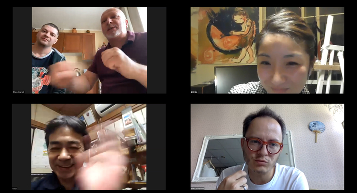 セルゲイプロデューサー、アンドレイム・イシュキン監督、翻訳・コーディネイトのドミトリー・トカチェンコさん、ロシア連邦国立極東芸術大学名誉教授の今瀬康夫さんと私で会議でした。