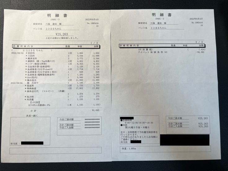 9月4日〜10月19日にかかった治療費について報告致します。