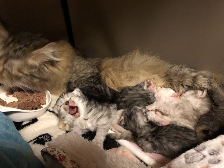 子猫7匹のうち、2匹は、現場に到着した時に目の前で産まれ、見回りをして10分程の間に姿がなくなり、親猫が食べたのか!心配しながら、探したら、ゴミ箱の中でペットシートに包まれた状態で発見!