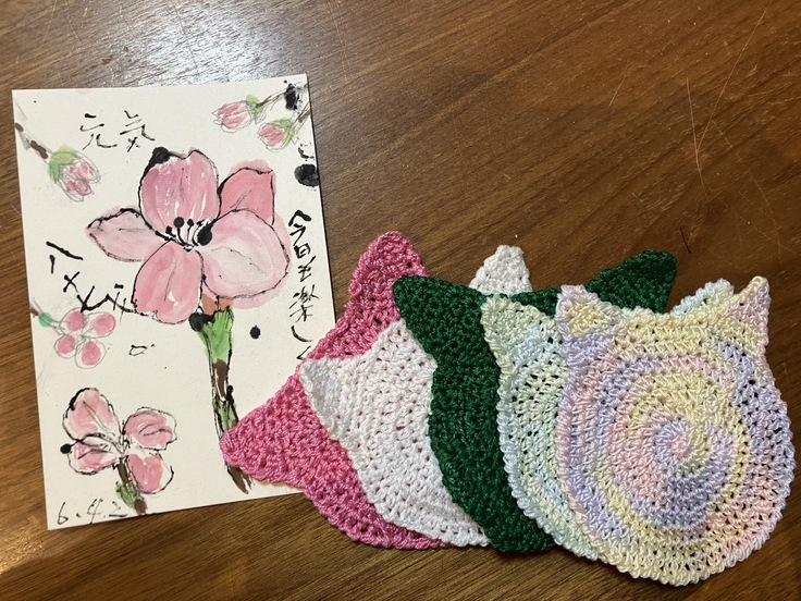 今回リターンの商品になった猫顔コースターと絵手紙は、母が応援してくださった皆さまへの感謝の気持ちとして、率先して、作ってくれた物です。