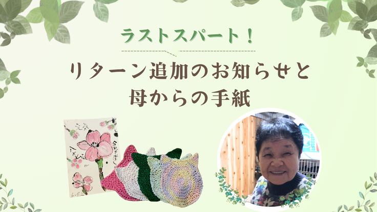 【リターン追加のお知らせ】代表の母「昌子」による手作りリターン「コースターと絵手紙」と母からの手紙。
