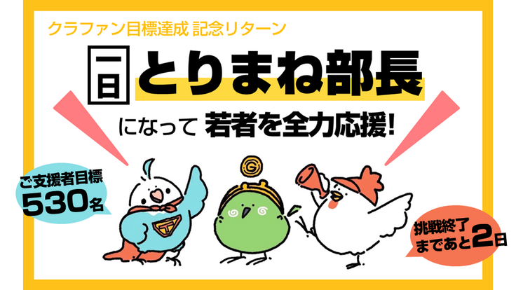 クラファン目標達成記念リターン【『一日とりまね部長』になって若者を全力応援】を追加!