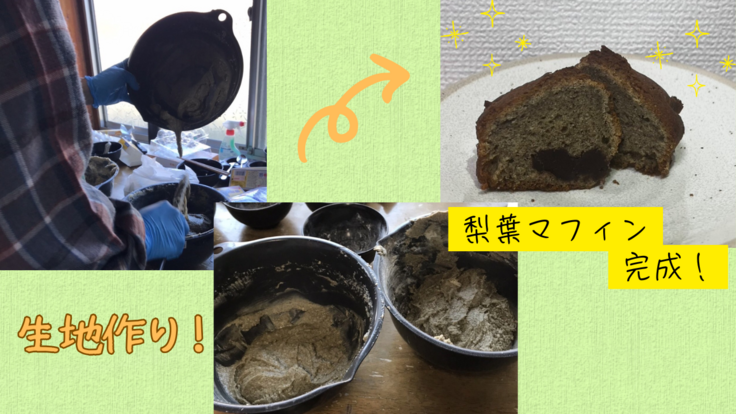 学生団体「結梨」が開発中の梨の葉を使ったスイーツの中で、2/26(日)の交流会に提供した「小倉梨葉マフィン」の試作を行った様子をお見せします!